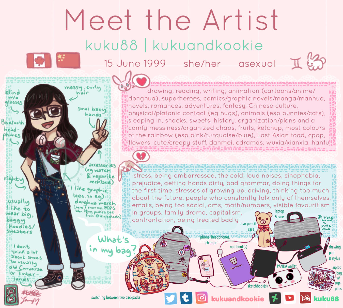 Hi, everyone! I'm Kuku (or you can call me Kookie—although as I like to tell people, the Kuku is me and the kookie is all of my lovely followers)! As you might have guessed, I love both writing and drawing, and when I'm not working or consuming media, I'm creating art and stories that I often post online. I have a passion for animation, writing novels, designing characters, world history, and (Chinese) culture.